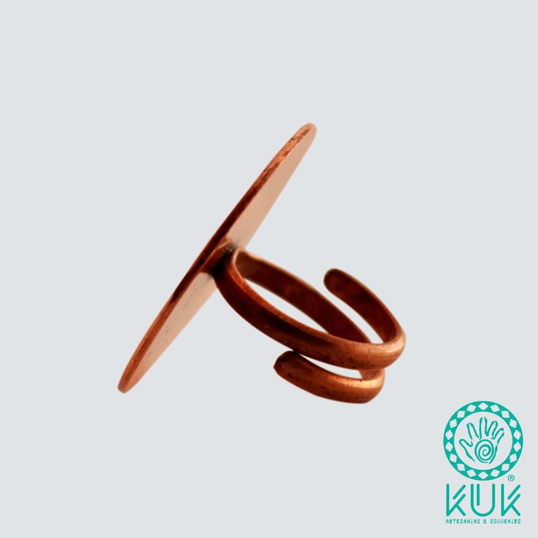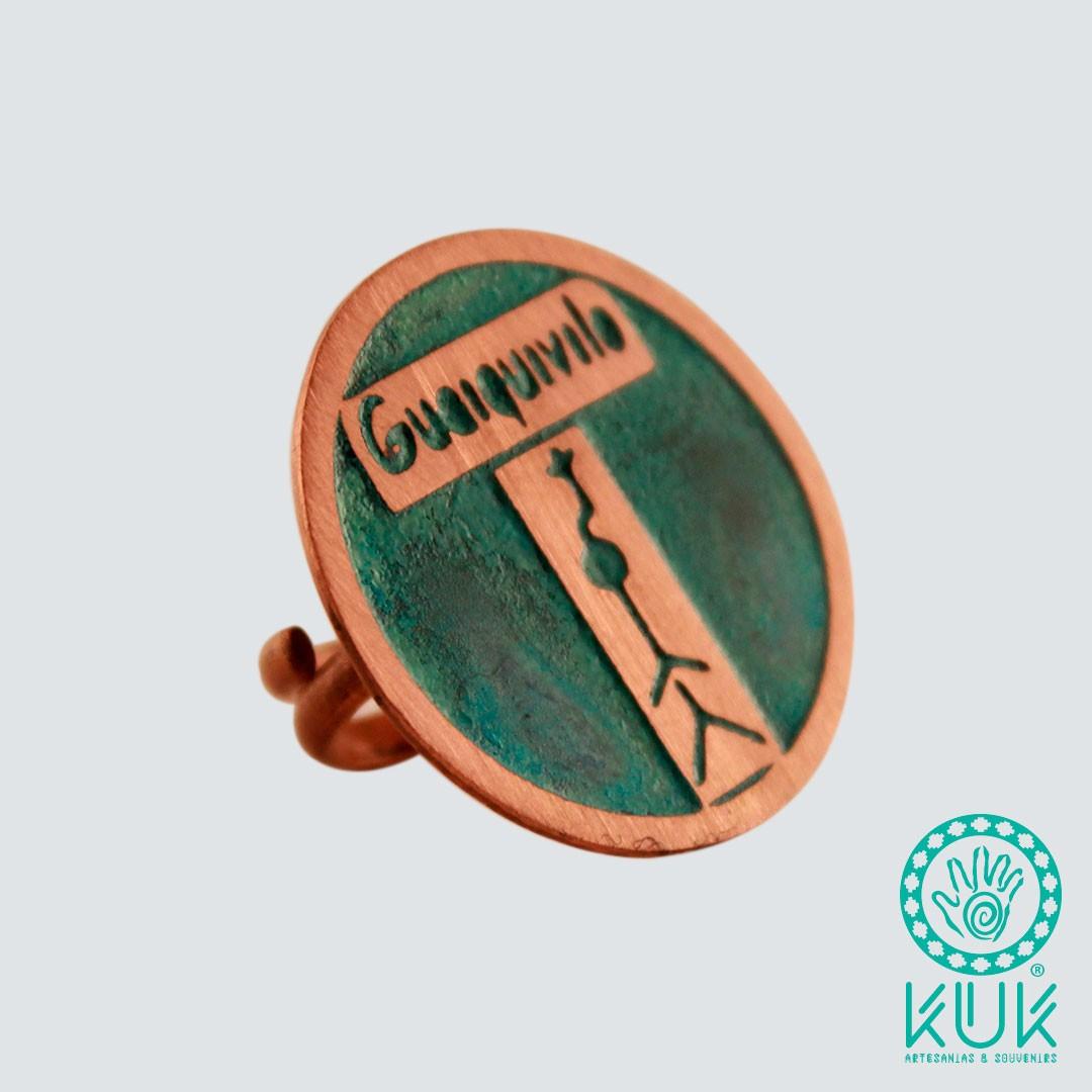 Anillo ajustable de cobre, diseño petroglifos de Guaiquivilo, Colbún – VII Región del Maule. Incluye tarjeta con información de los petroglifos del Maule en inglés y español. Hecho a mano.