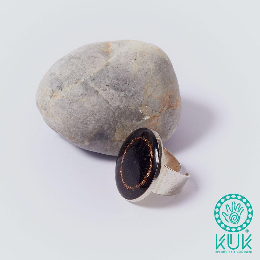 Anillo ajustable de crin color negro, con hilo de cobre y resina transparente de acero.