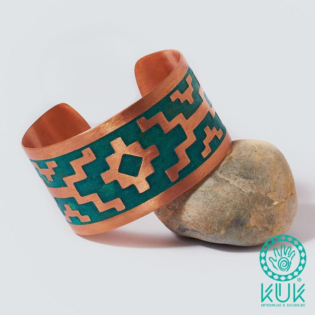 Brazalete de cobre con textura al ácido. Diseño cruz chacana (4 cms de ancho).