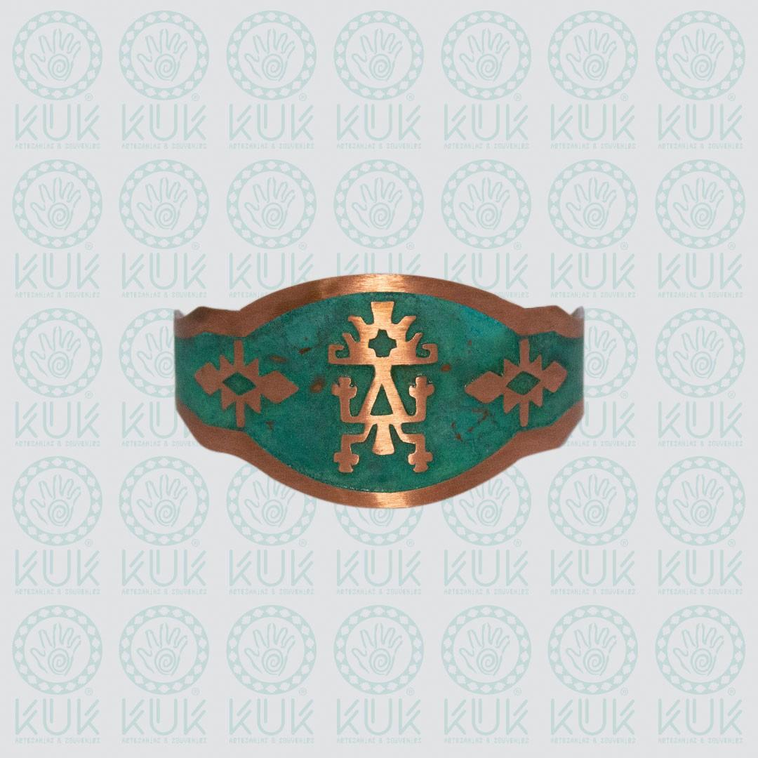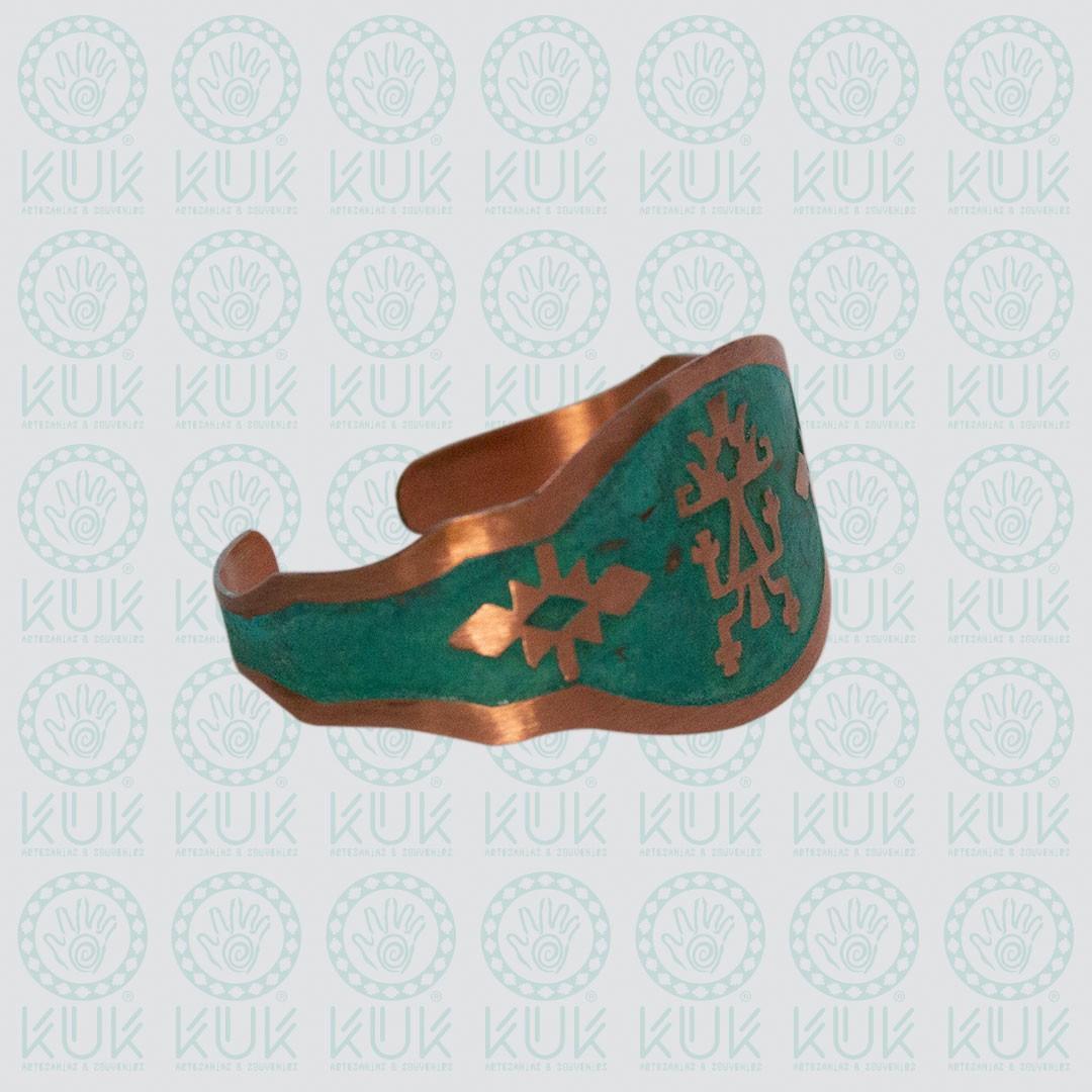 Brazalete de cobre con textura al ácido. Diseño lukutel (4 cms de ancho). El lukutuwe (del mapudungun: lugar donde se arrodilla), denominado también lukutuel (del mapudungun: arrodillado), es un símbolo antropomorfo, que aparece en diseños textiles mapuche.