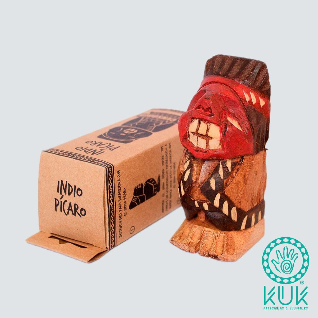 Indio Pícaro, figura de madera con diseño típico Mapuche. Hecho a mano. Incluye caja.