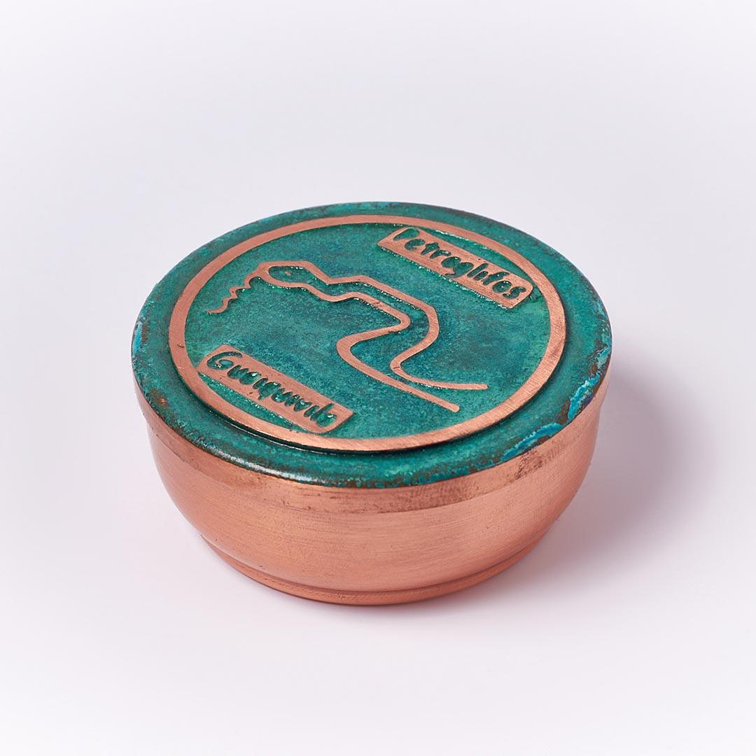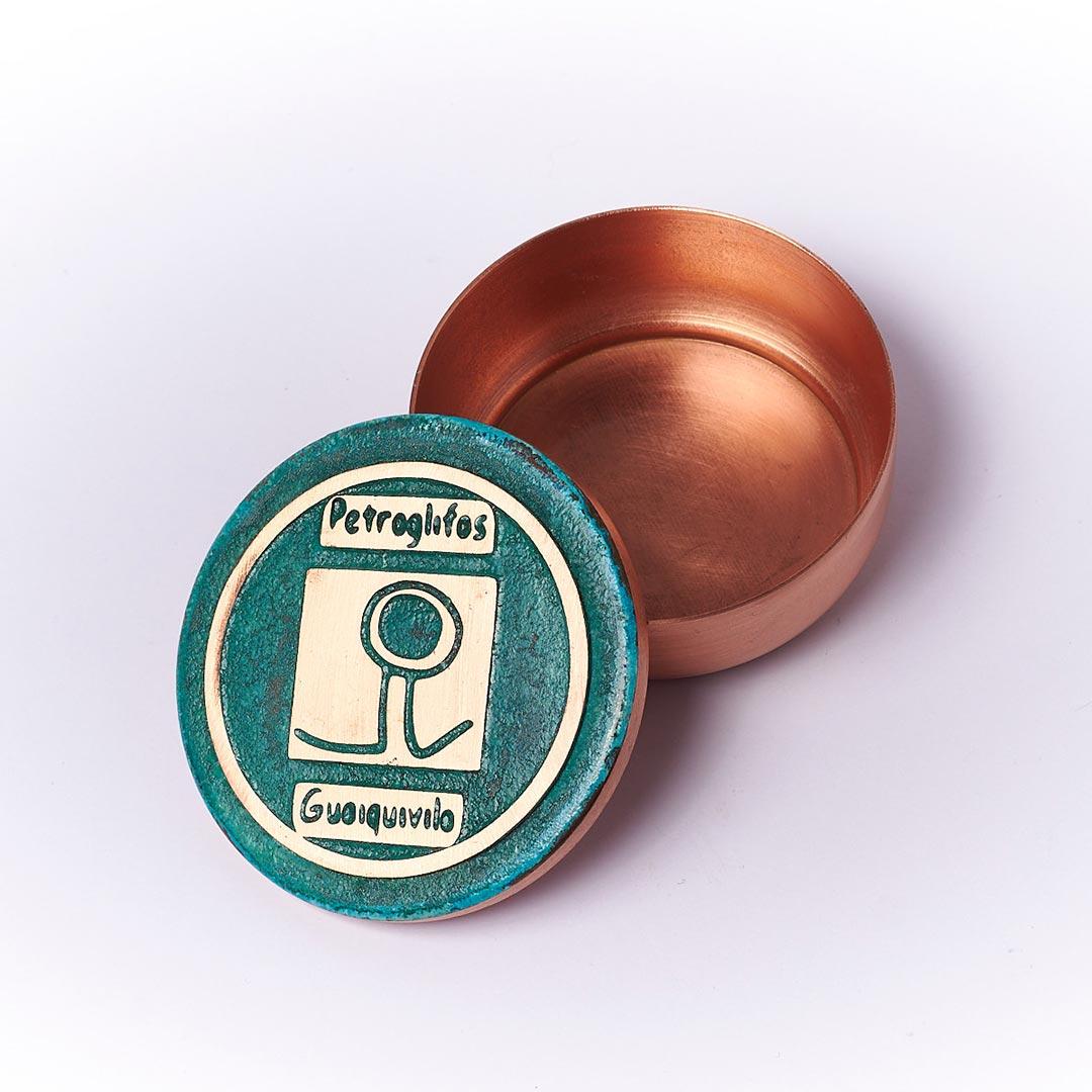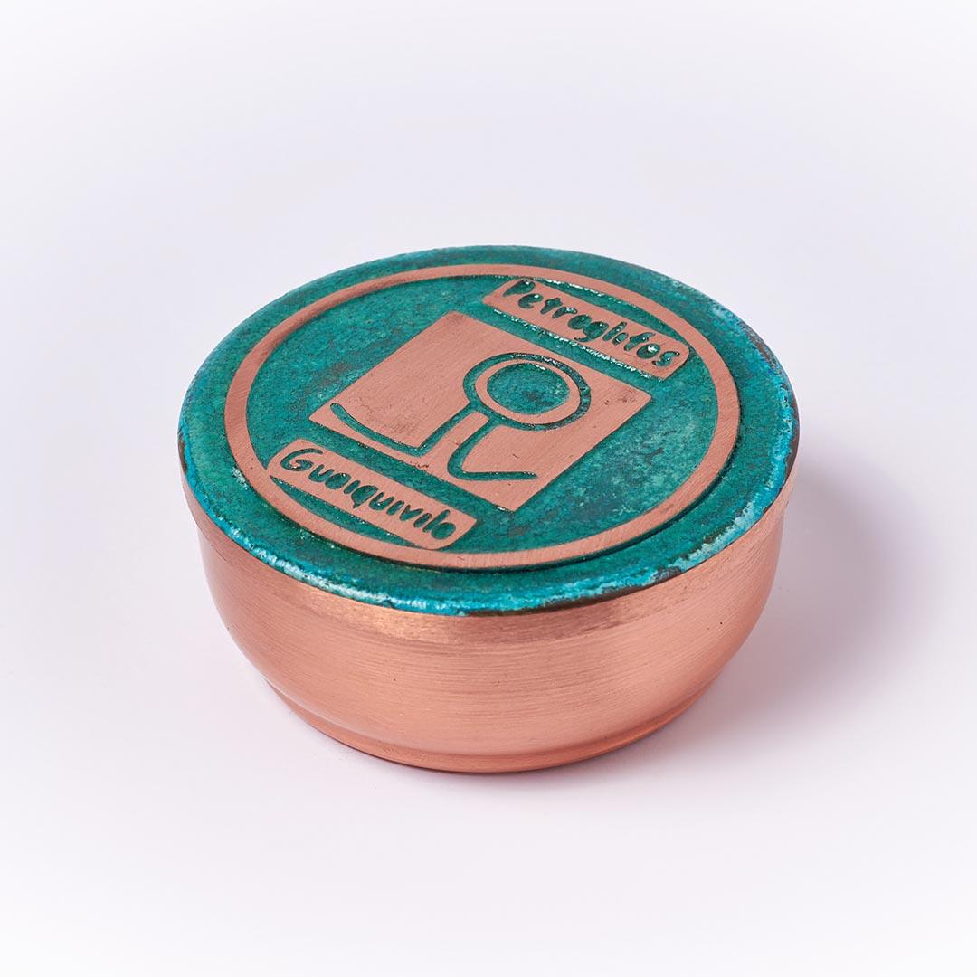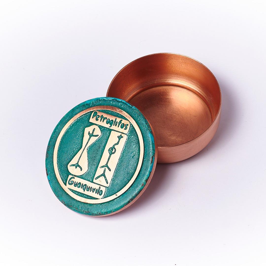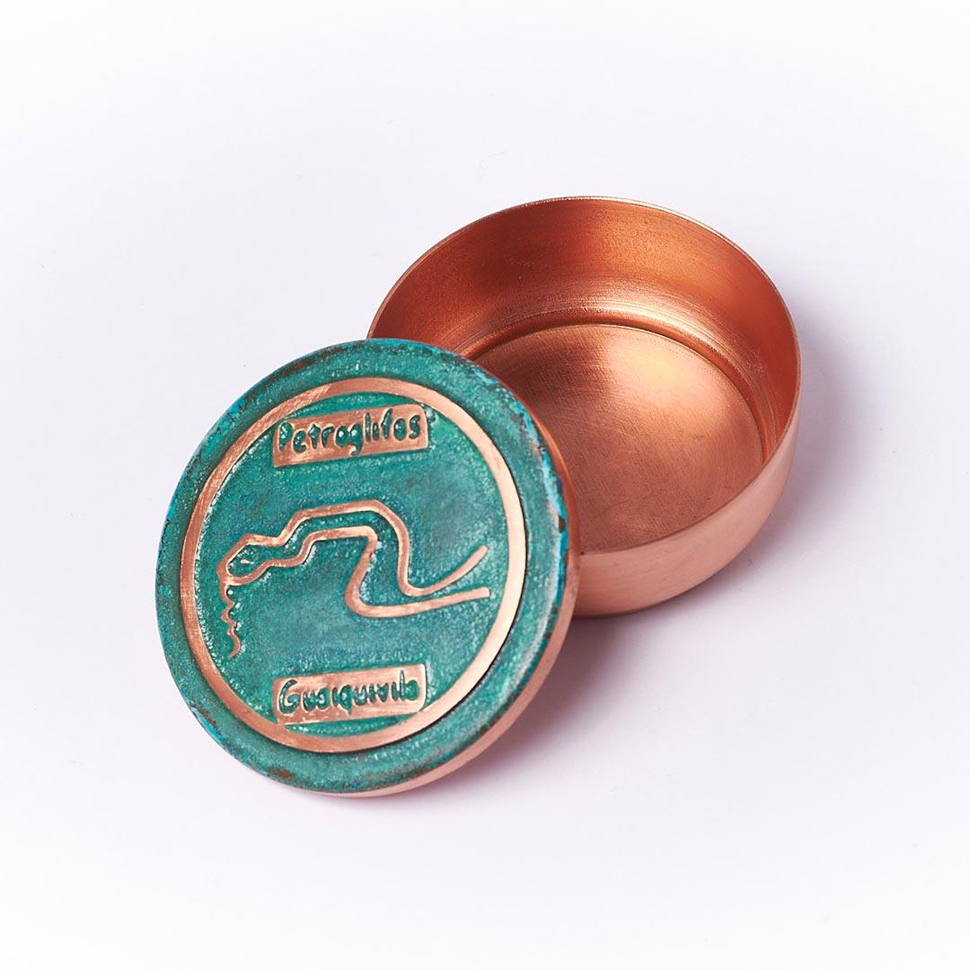 Joyero de cobre diseño petroglifos de Guaiquivilo con textura al ácido.