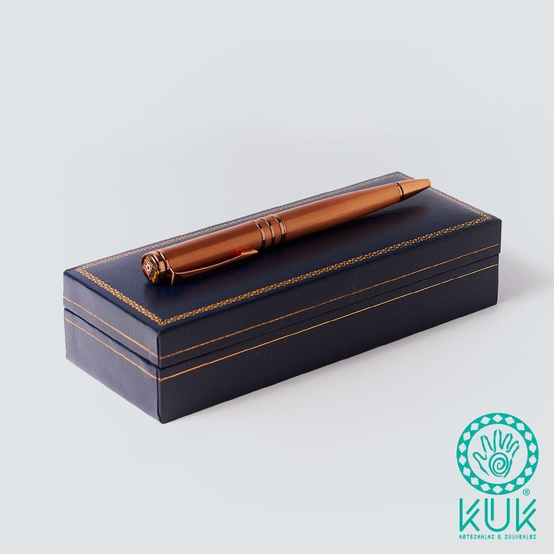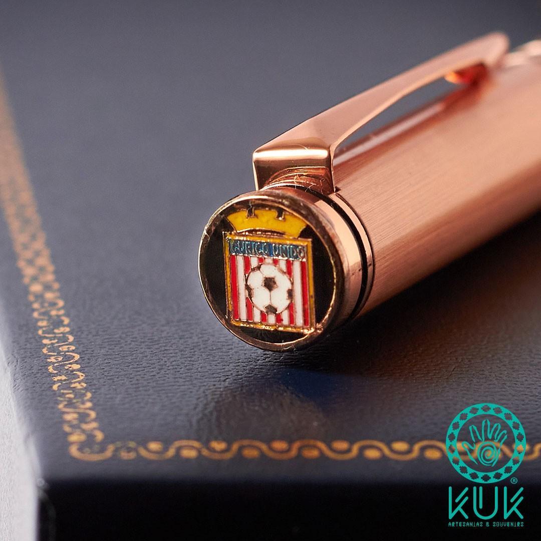 Lápiz de pasta color negro, con repuesto recargable, bañado en cobre esmaltado con diseño en su tapa de Curicó Unido, en caja con autoadhesivo de bandera de Chile.