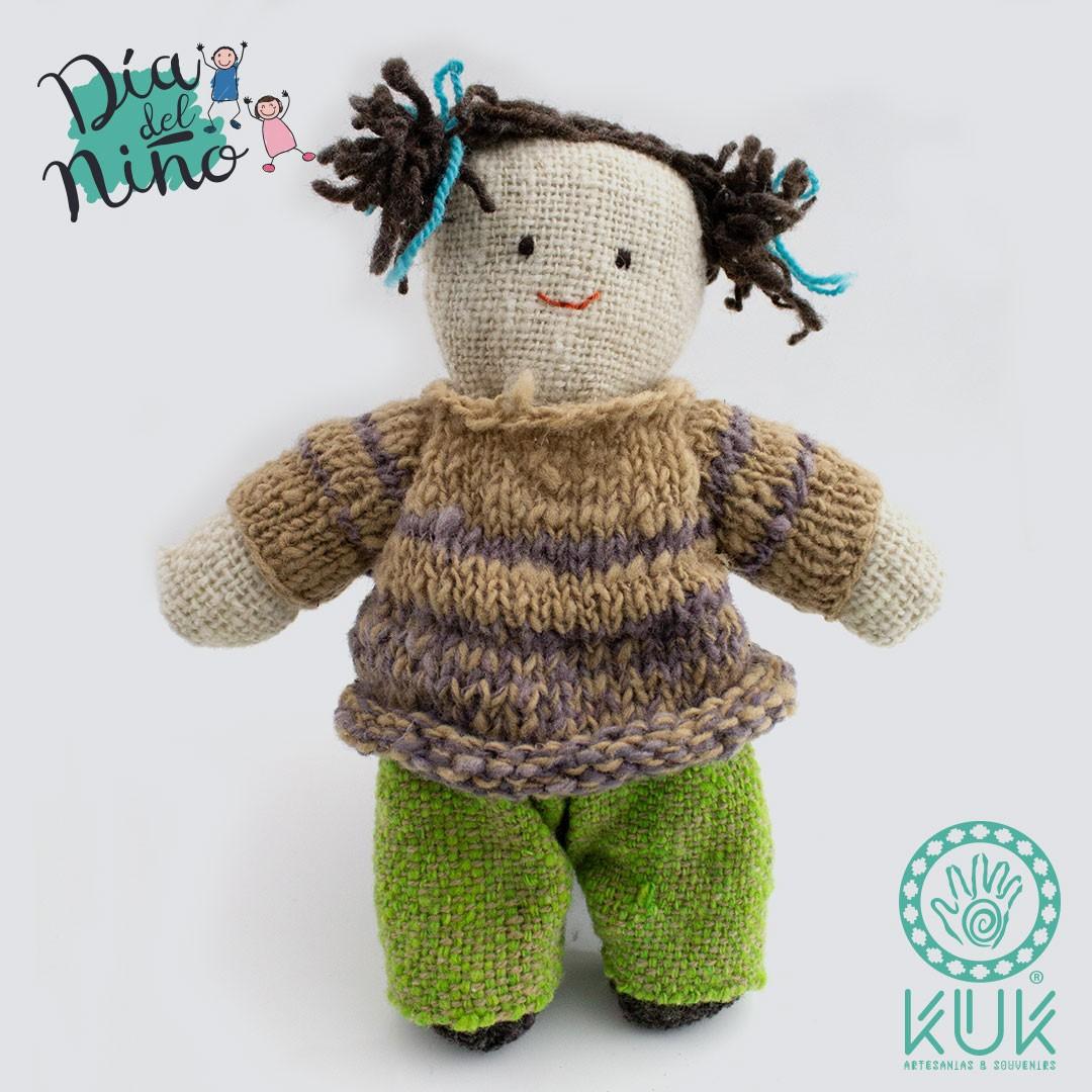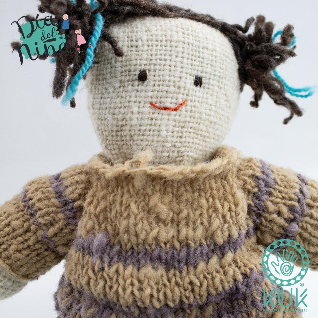 Muñeca de lana teñida con vegetales y tejida a mano por la artesana maulina Laura Ramos, Sello de Excelencia del Consejo de la Cultura y la UNESCO.