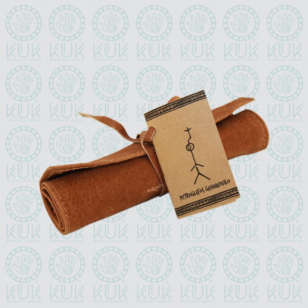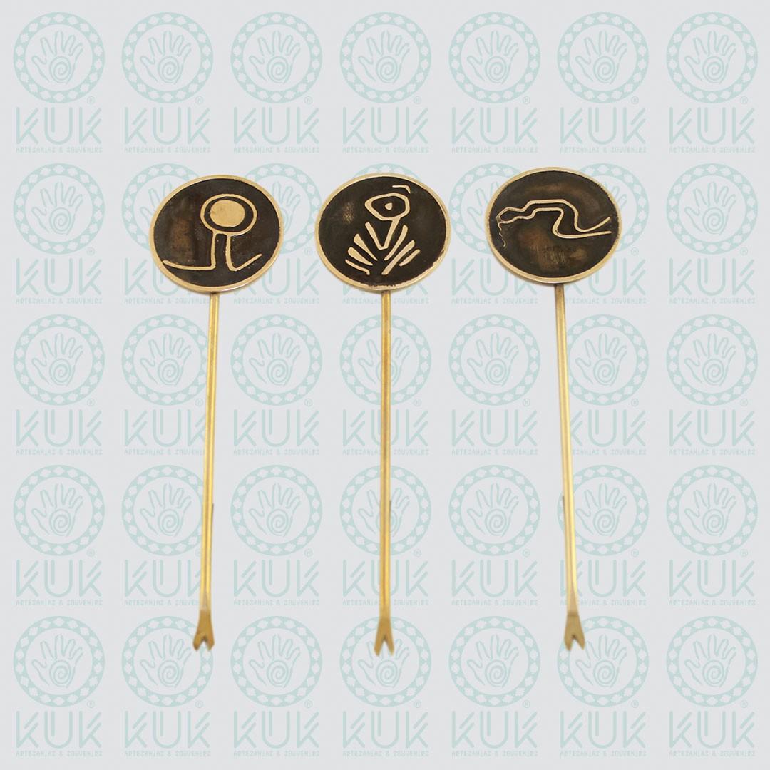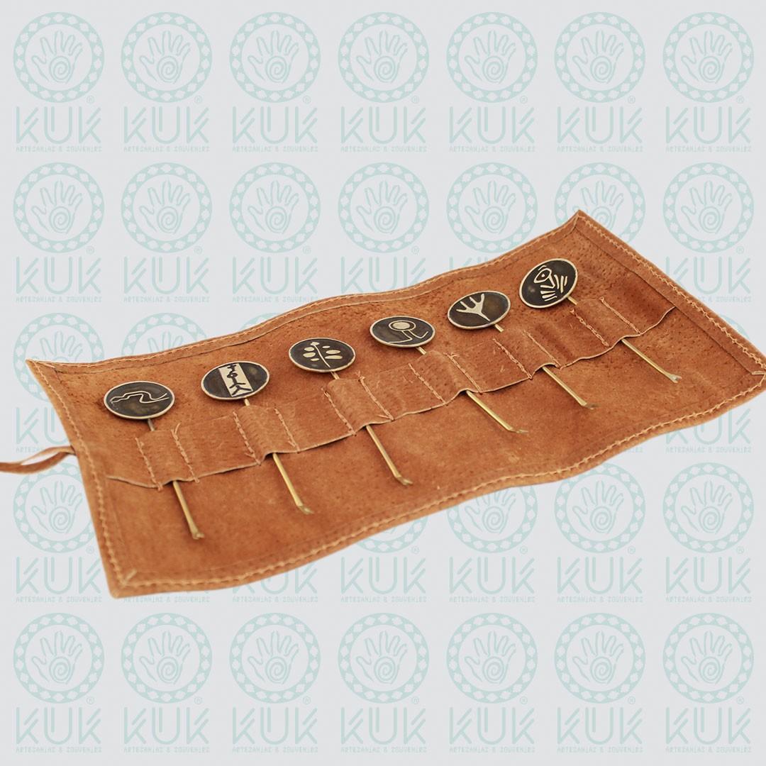 Set de pinchos de alpaca con diseño de petroglífos de Guaiquivilo, Colbún – VII Región del Maule, con funda de cuero de reno en color café o negro.