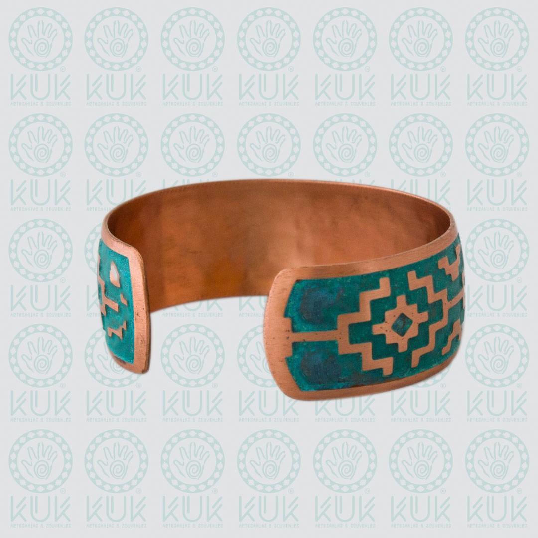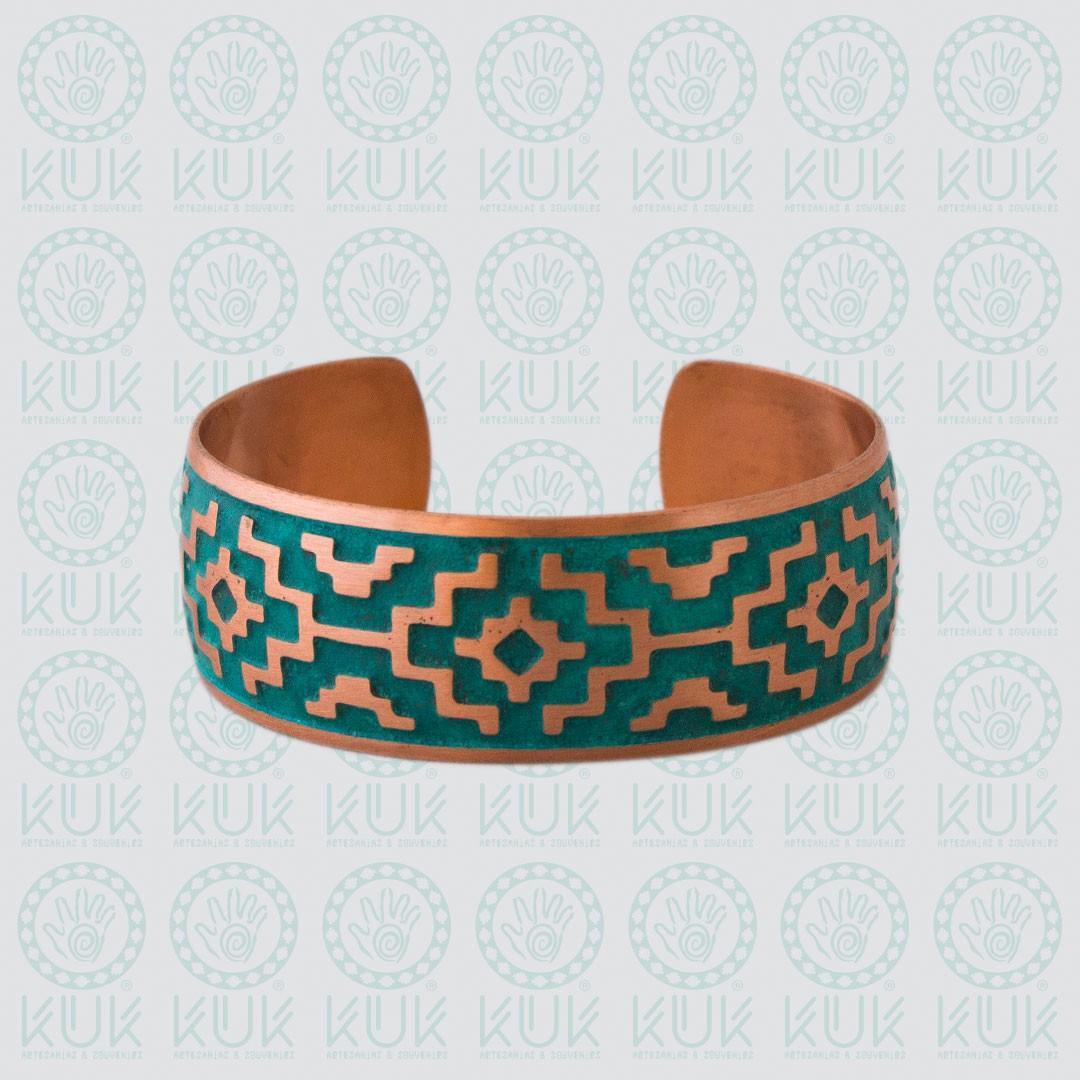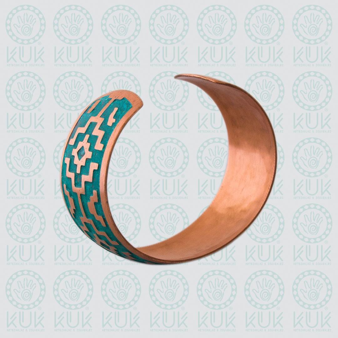 Pulsera de cobre con textura al ácido, diseño Mapuche Chacana. Hecho a mano.