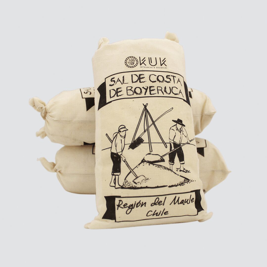 Sal Costa Boyeruca, saco de tela ecológica con la historia de los salineros de Boyeruca, de 1 kilo o medio kilo, producto de la región del Maule