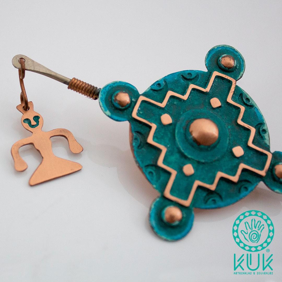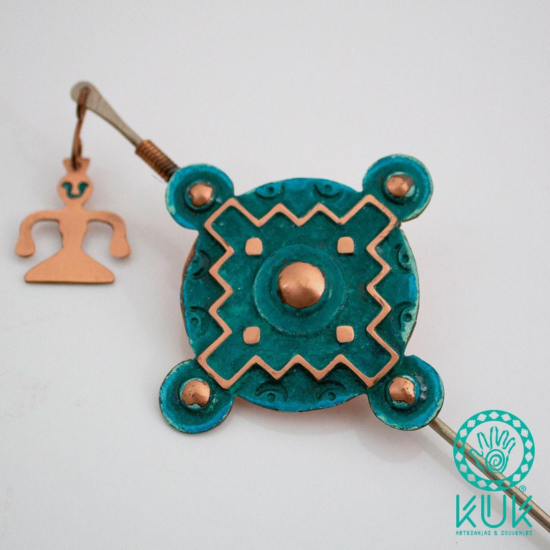 Tupus de cobre con textura al ácido, diseño Mapuche, Hecho a mano.